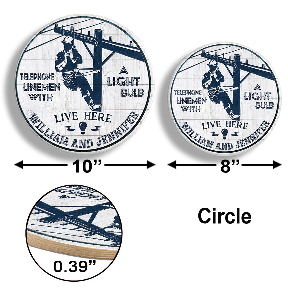 Personalized A Telephone Lineman With A Light Bulb Live Here Pallet Wood Circle Sign