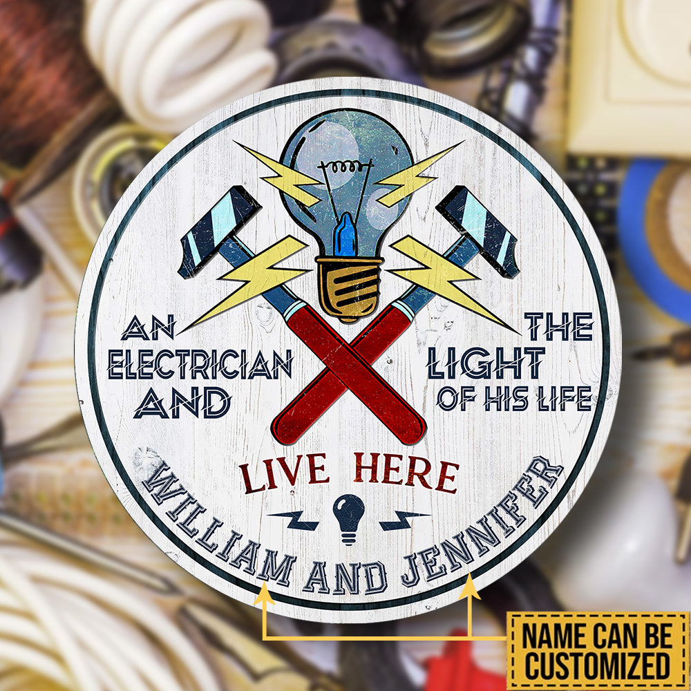 Personalized An Electrician And The Light Of His Life Live Here Wood Round Sign