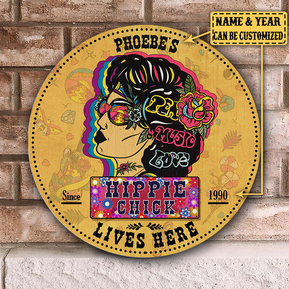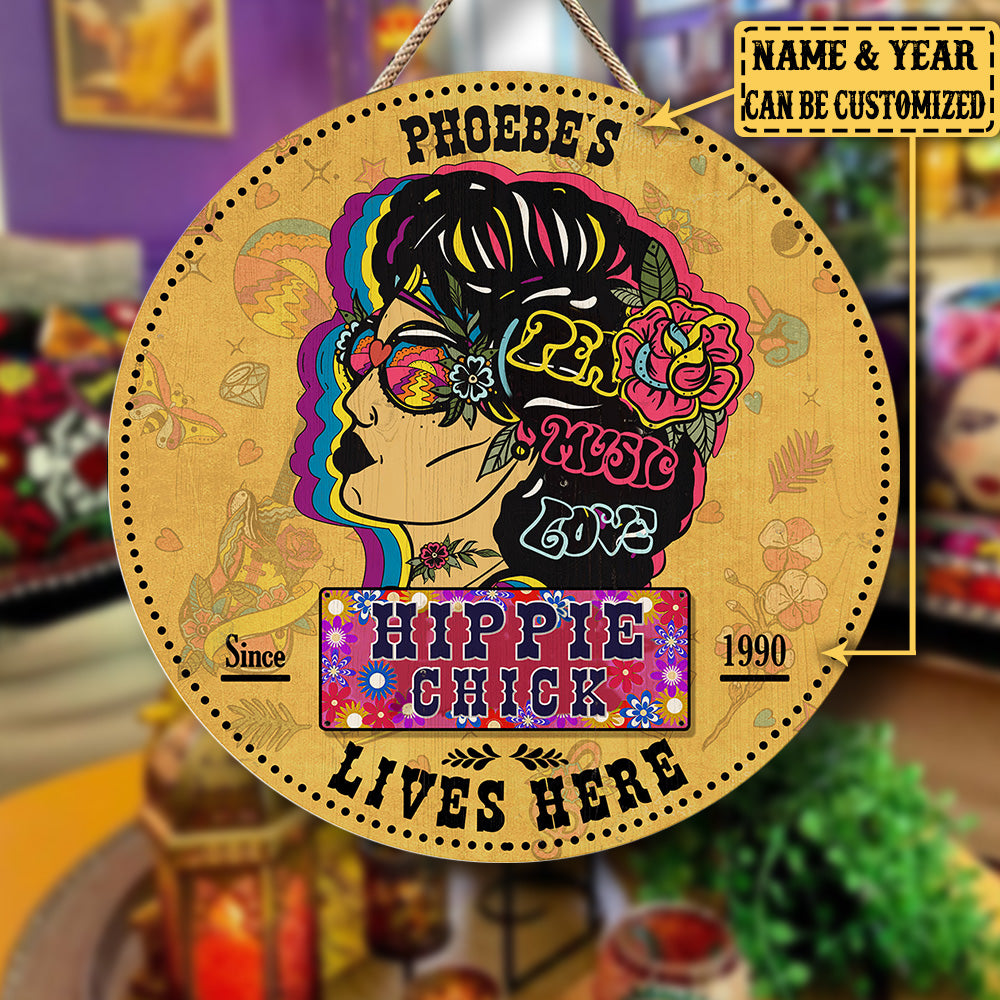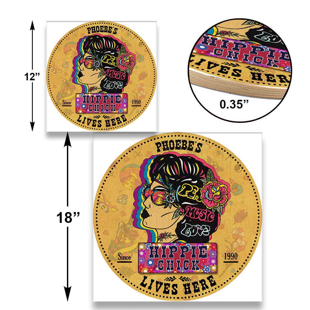 Personalized Hippie Chick Lives Here Wood Round Sign