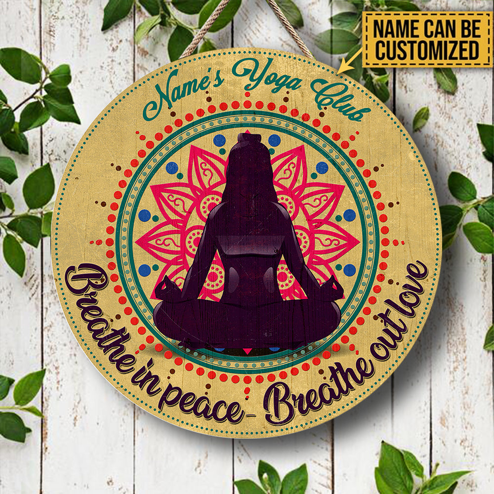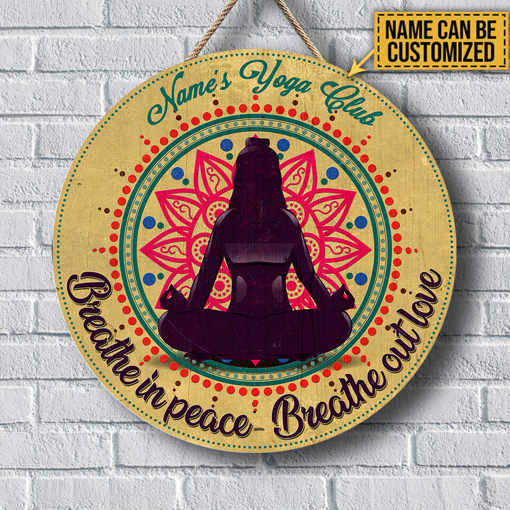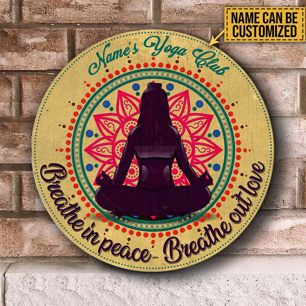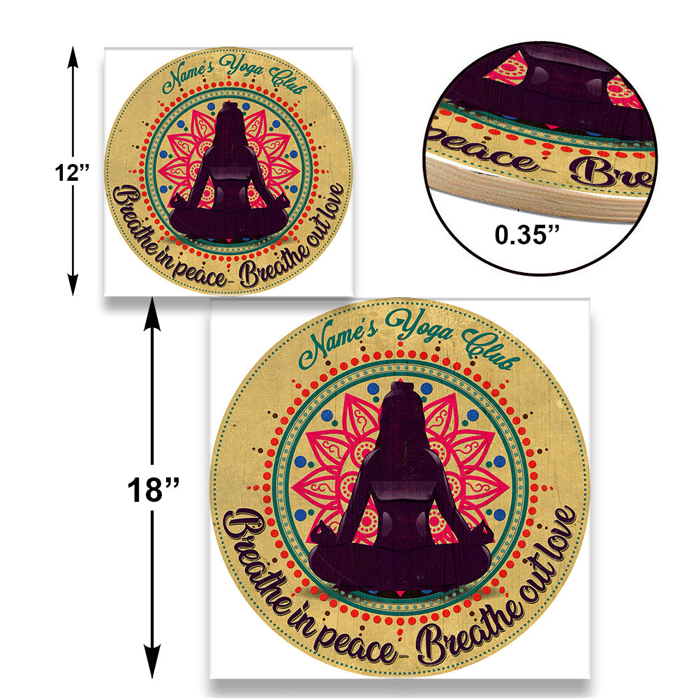 Personalized Yoga Club Breathe In Peace Breathe Out Love Wood Round Sign