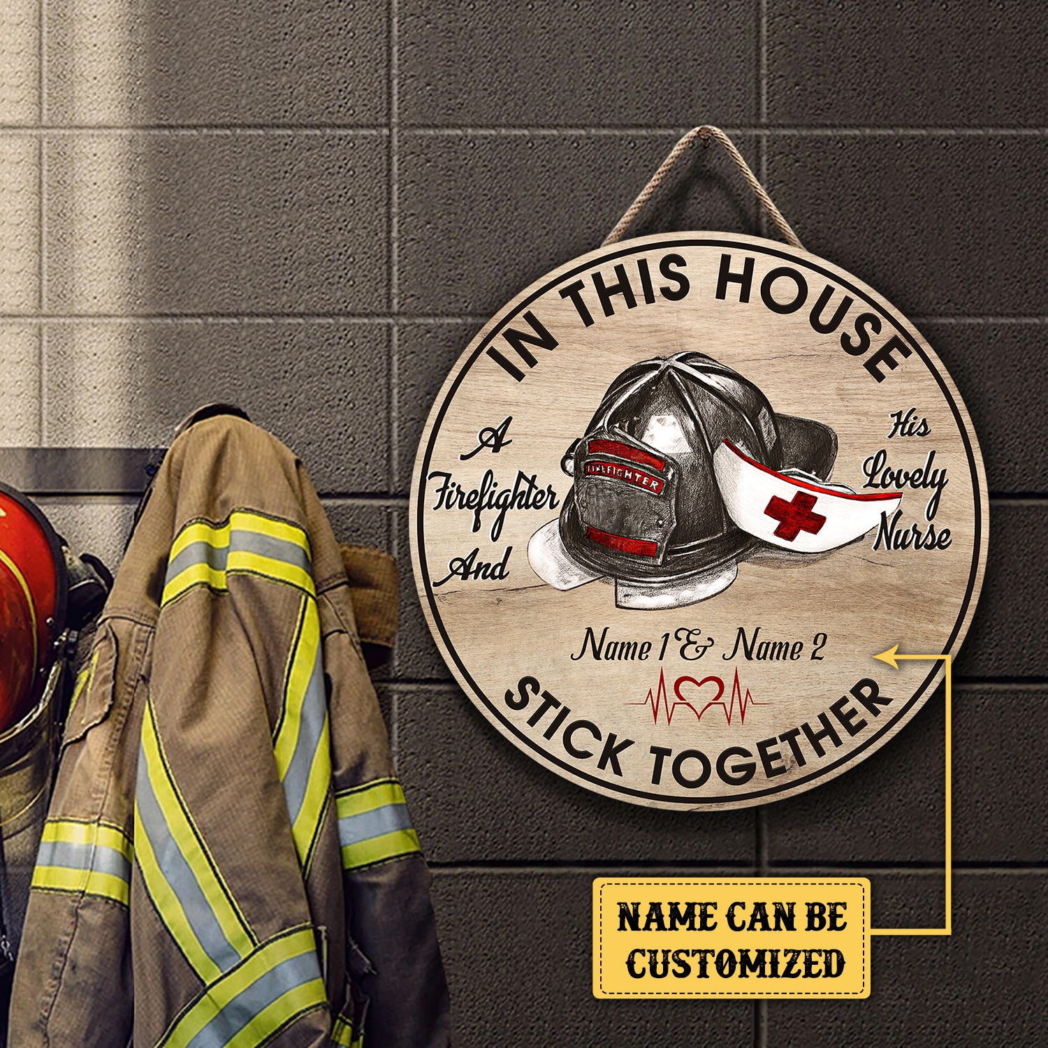 Personalized In This House A Firefighter And His Lovely Nurse Stick Together Wood Round Sign