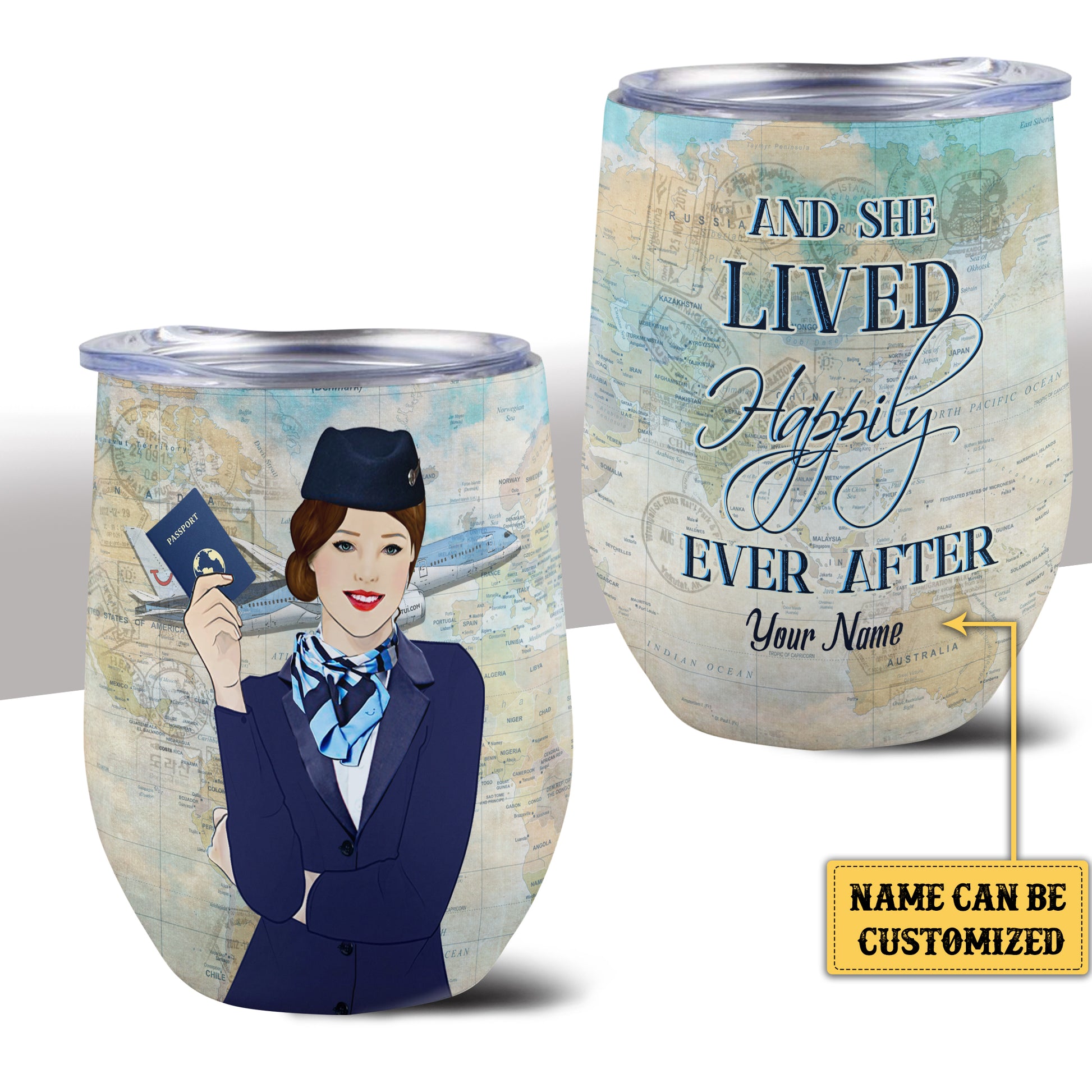 Personalized And She Lived Happily Ever After Flight Attendant Wine Tumbler