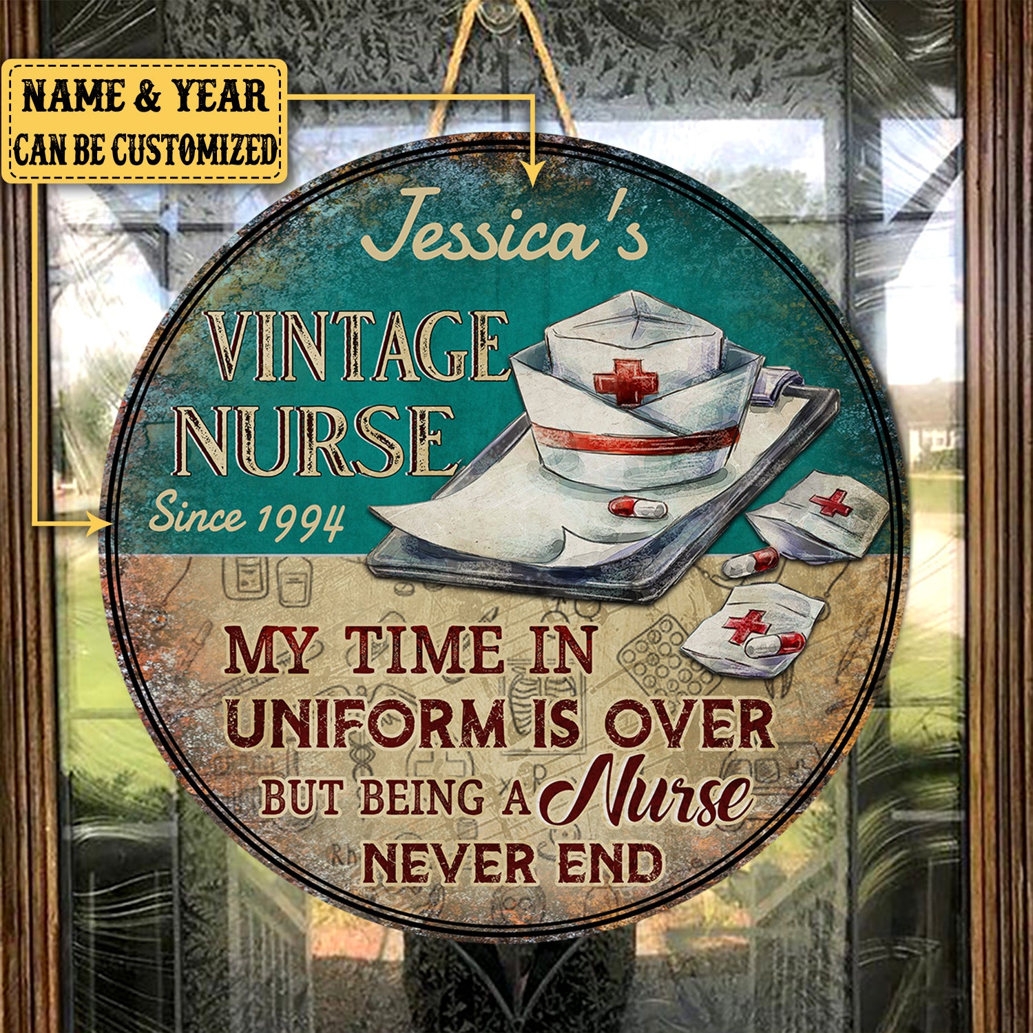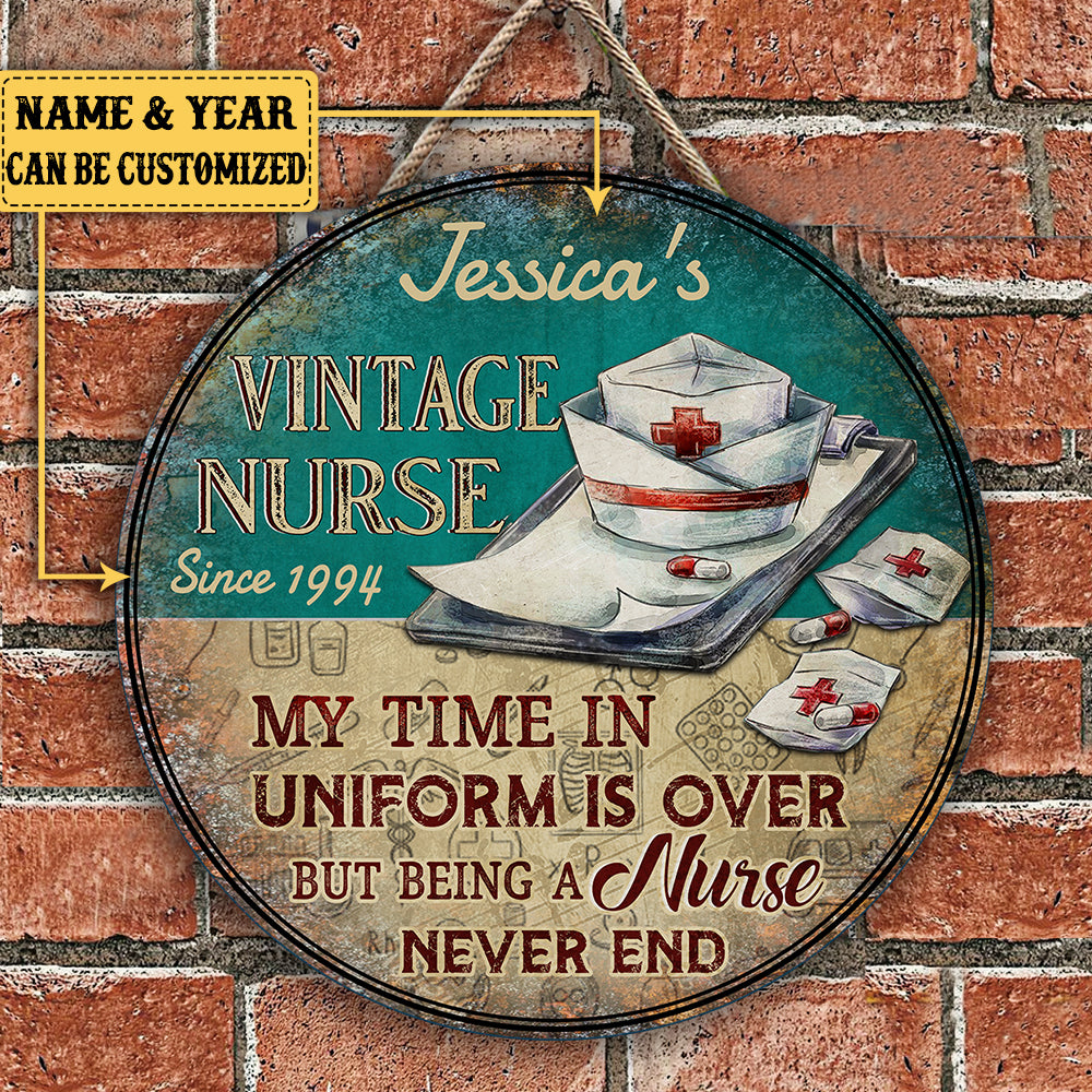 Personalized My Time In Uniform Is Over But Being A Nurse Never End Wood Round Sign