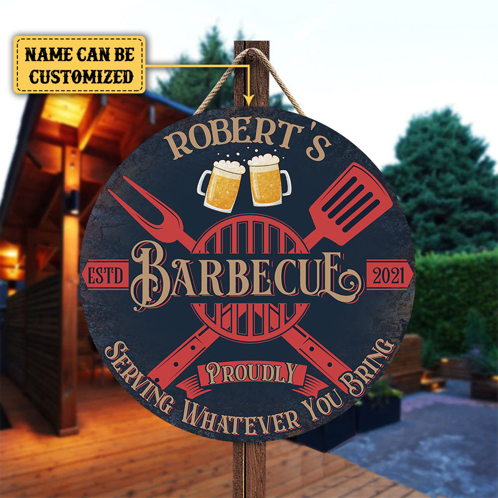 Personalized Barbecue Serve Whatever You Bring Wood Round Sign