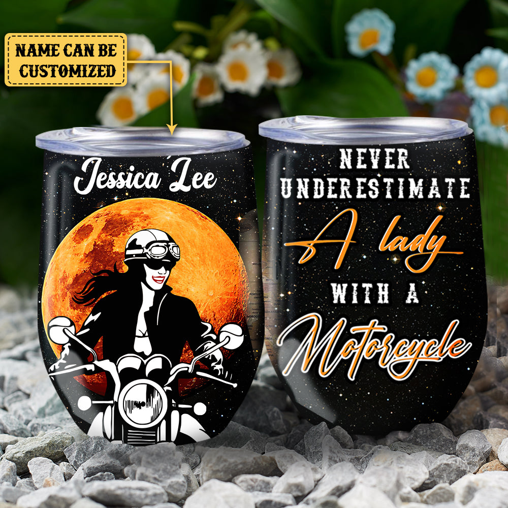 Personalized Never Underestimate A Lady With A Motorcycle Wine Tumbler
