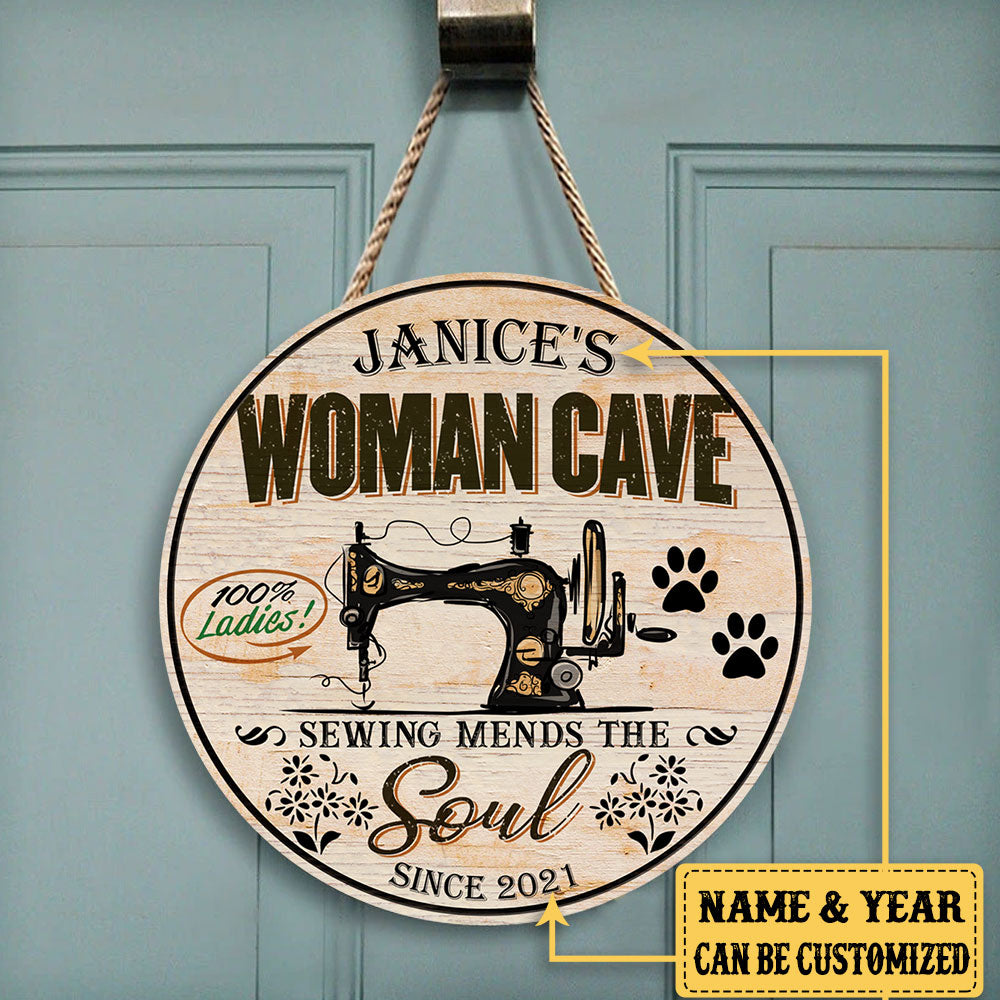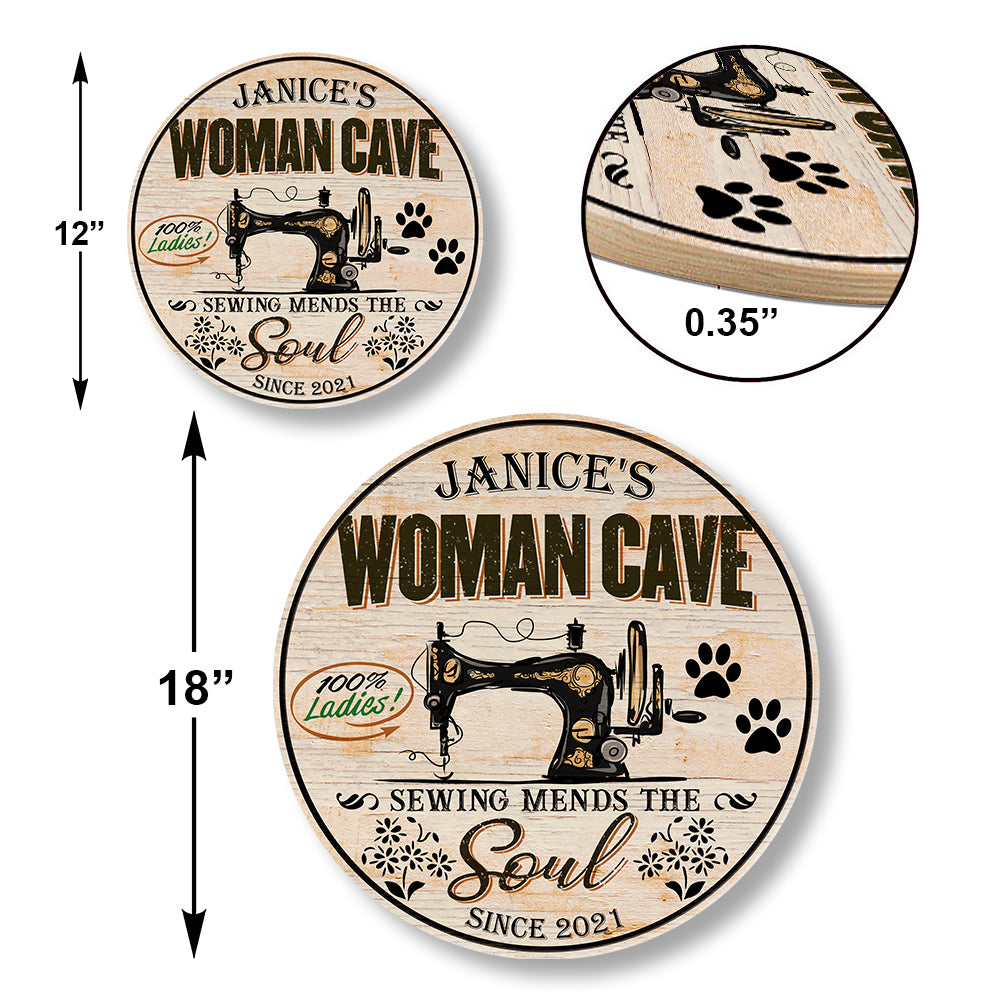 Personalized Sewing Room Woman Cave Wood Round Sign
