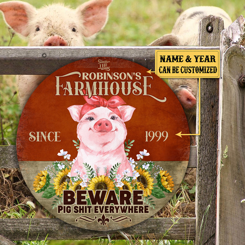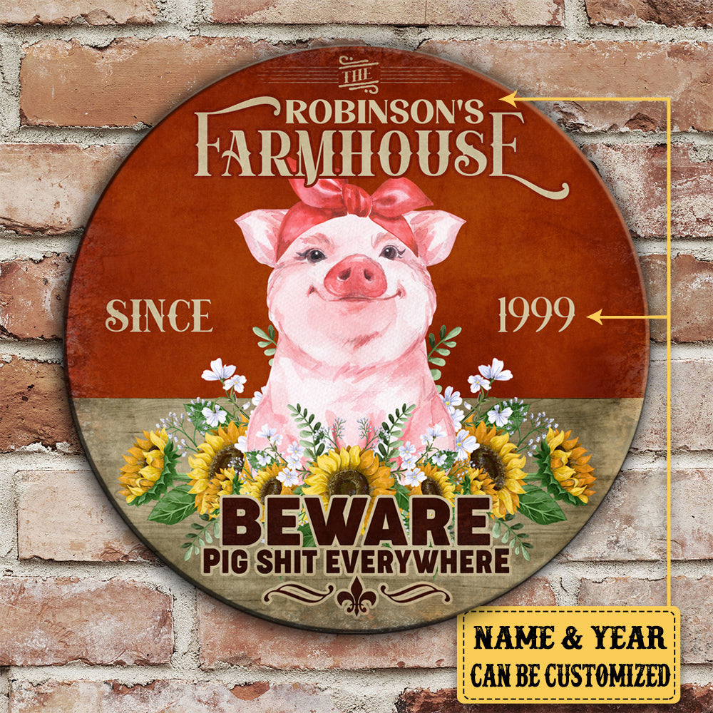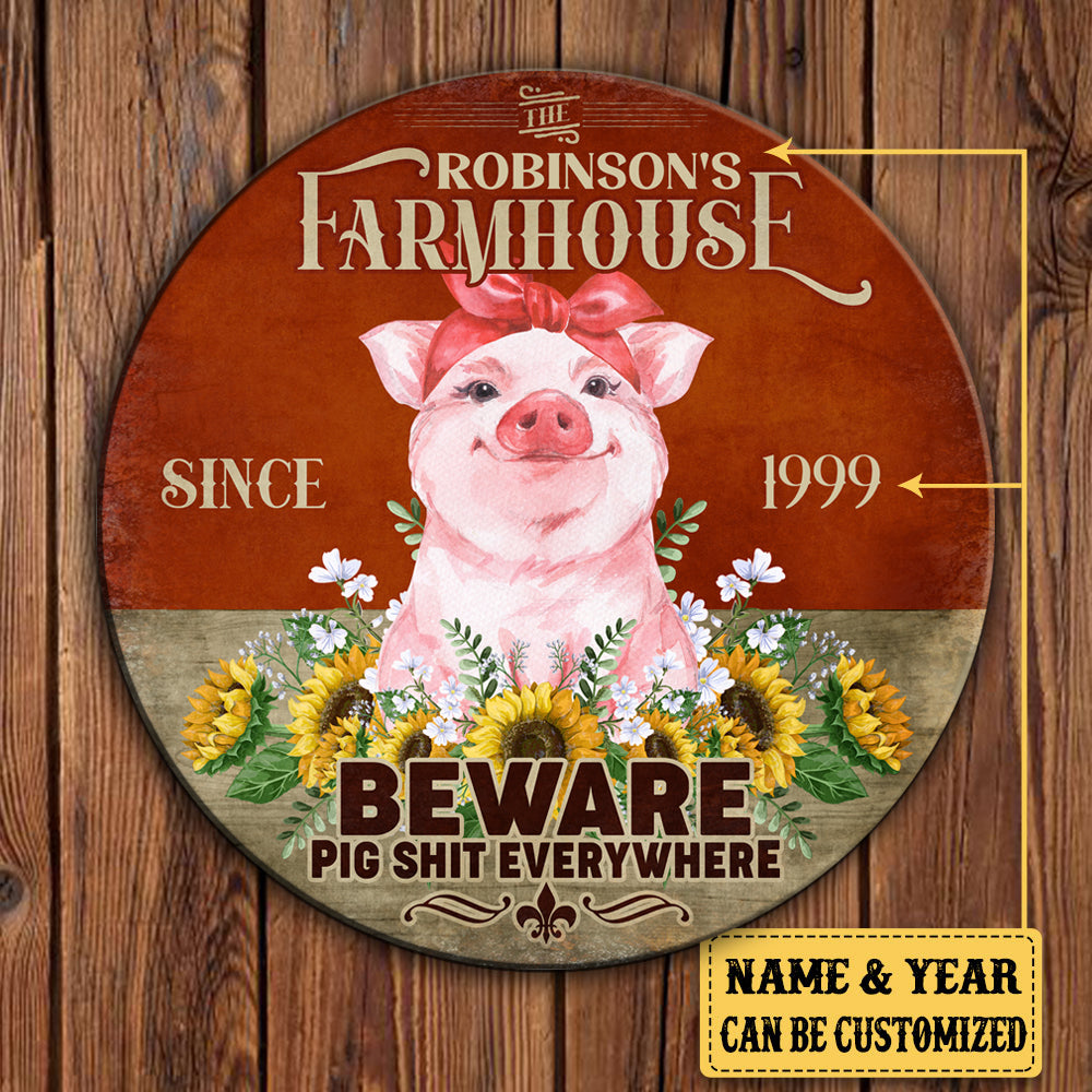 Personalized Pig Farm House Beware Wood Round Sign