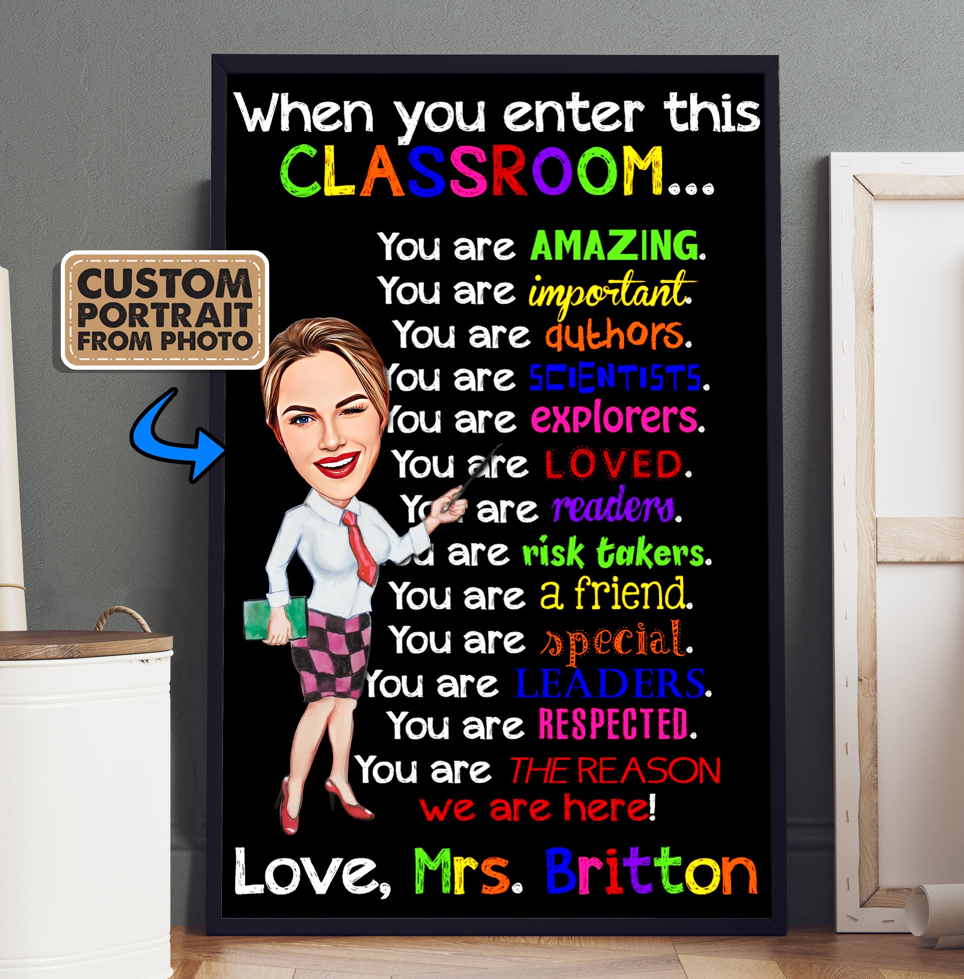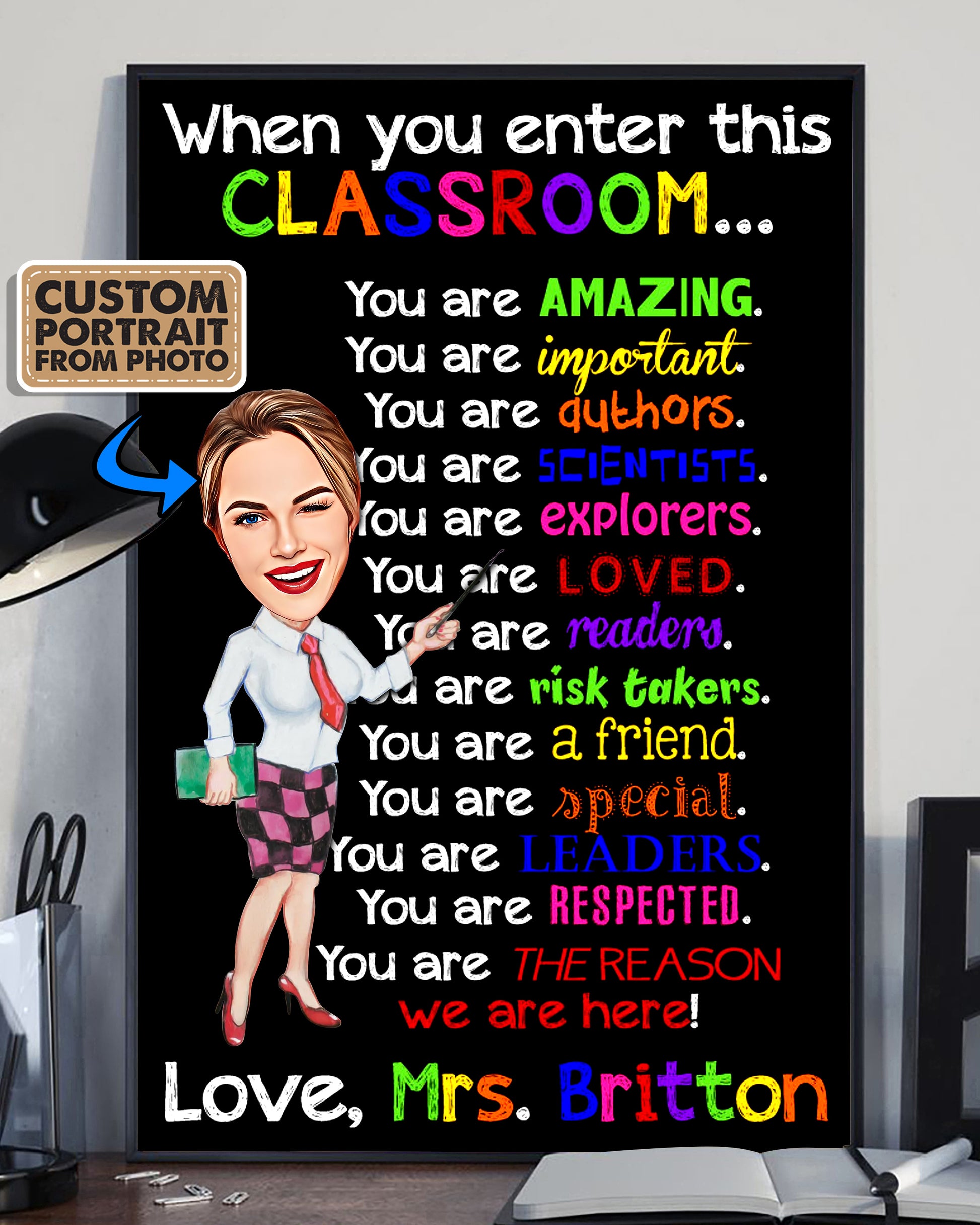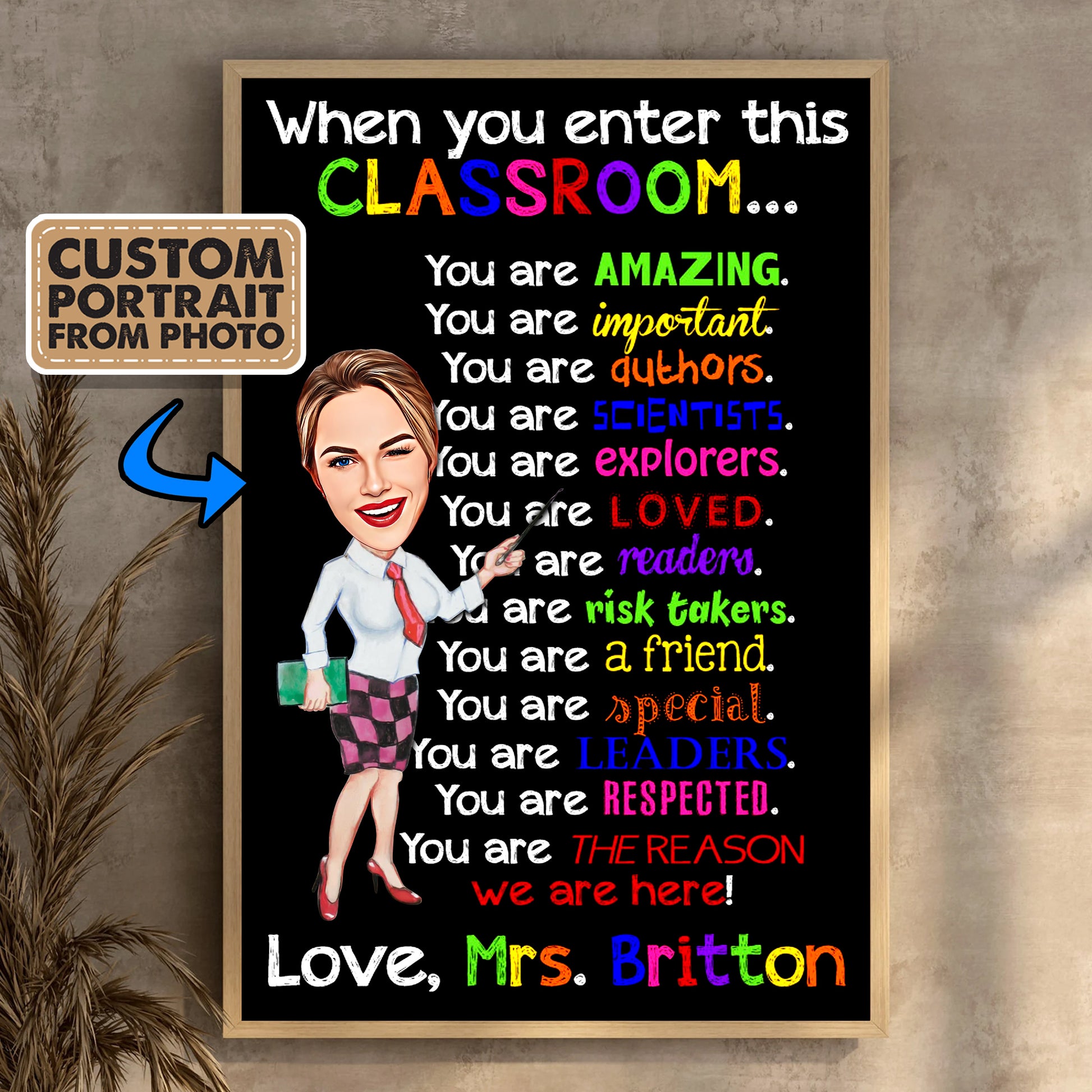 When you enter this Classroom You are Amazing - Custom Name Teacher Poster Canvas - Custom Cartoon Portrait From Your Photo - Back To School